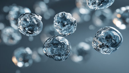 Close-up of round, translucent structures with interior details, blue tones, suggesting cell-like formations