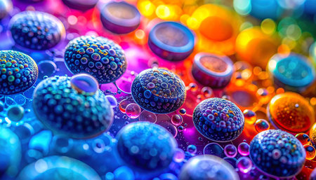 An abstract microscopic structure is depicted against a dark backdrop. The image showcases rounded, cellular-like forms with a range of iridescent colors and textures. The composition utilizes backlighting, highlighting the internal structures. Suitable for scientific visualizations or design concepts, it can be used for various commercial projects.