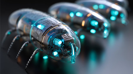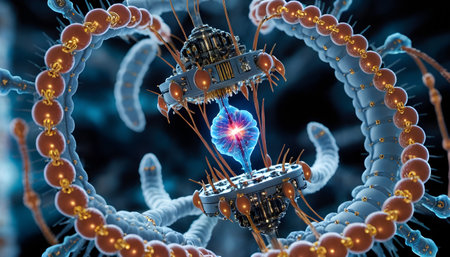 A closeup view revealing the nanoscale interface of a robotic device featuring microsized sensors and delivery mechanisms. The image showcases innovative technology where the sensor