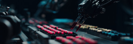Robotic arms equipped with syringes precise various colored buttons in a modern lab setting, showcasing technology in action during testing procedures.
