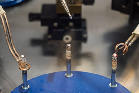 Gloved hands operating high tech precision equipment in laboratory setting
