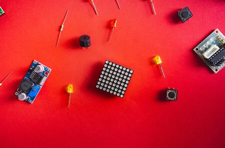 Micro electronics arduino DIY components over red background, top view, copy space. Microcontrollers, boards, sensors, leds, controllers