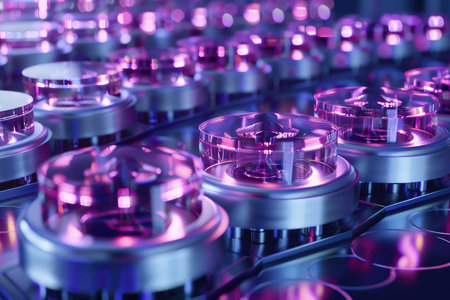 This vibrant close-up image captures metallic components with coils, illuminated by colorful lighting to create a dynamic and modern atmosphere.