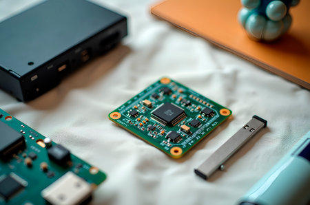 This close-up image features electronic components arranged in a precise pattern, reflecting on a glossy surface, showcasing intricate circuitry and craftsmanship.
