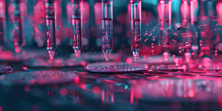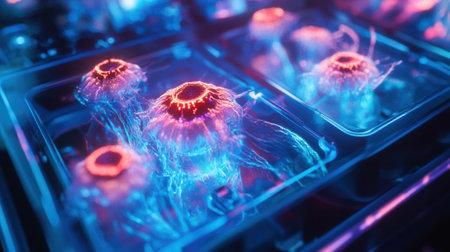 A scientist carefully examines a laboratory sample under a microscope in a high-tech environment bathed in vibrant neon lighting, showcasing innovation in research.