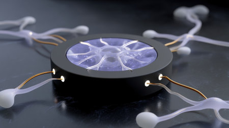 Laboratory equipment demonstrates advanced microfluidics with visible fluid flow and intricate design.