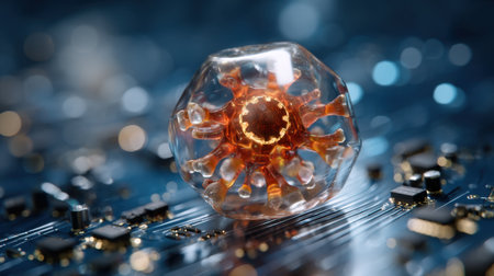 This captivating image features a detailed representation of a virus structure set against a backdrop of electronic circuit components, symbolizing the fusion of technology and biology. The intricate details and vibrant colors create a stunning visual experience, making it ideal for projects related to science, health, and innovation.