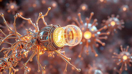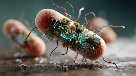 This imaginative image showcases a unique blend of microbial life and advanced technology, highlighting the fascinating interplay between biology and innovation.