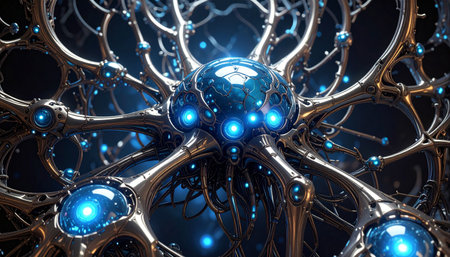Stylized digital illustration of a complex neural network with glowing spheres and connecting lines on a dark background. Represents artificial intelligence, data science, and digital communication systems. Ideal for tech, innovation, and machine learning themes.