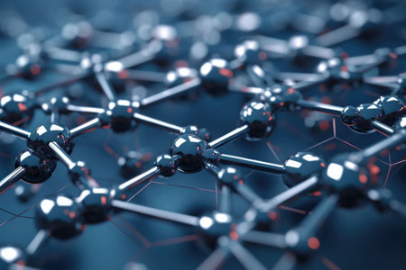 A detailed view of multiple metal balls and chains arranged closely together, Graphene, one atom thick, under a powerful microscale lens, AI Generated