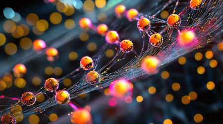 This abstract image showcases interconnected spheres and filaments with a shallow depth of field, creating a sense of dimension. The design features a dark background, contrasted by glowing spheres and delicate lines. This image could be used in various commercial applications, including marketing, technology presentations, and design projects.