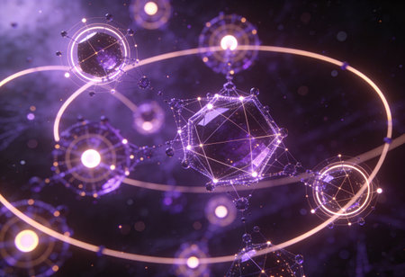 A futuristic depiction of molecular structures and neural networks, featuring glowing blue and orange digital connections, representing AI, quantum computing, and biotechnology.