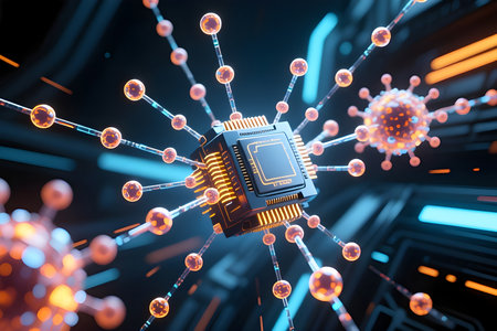 A cutting-edge conceptual image illustrating the connection between a central processing unit (CPU) and molecular or viral structures. Featuring glowing orange.