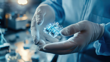 A person is holding a small electronic device in their gloved hand. The device is blue and he is a computer chip. Concept of precision and care
