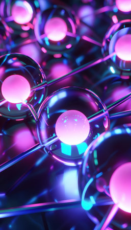 Vibrant 3d spheres interconnected by neon lines create a futuristic network concept in striking shades of cyan and purple. this visually captivating scene illustrates digital connectivity themes perfect for modern design projects.