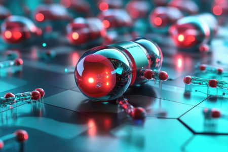 A detailed view of sleek red capsules among intricate molecular models on a dark, high-tech surface.