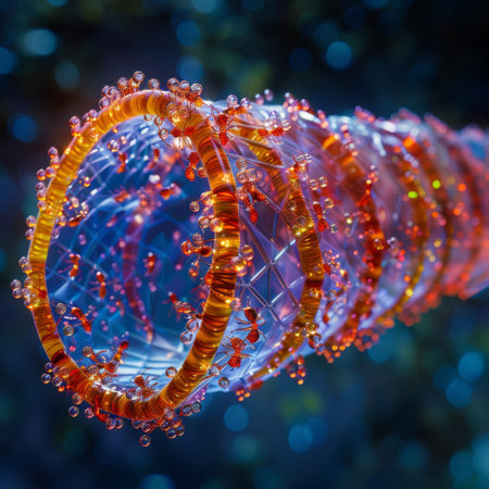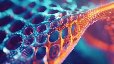 Close-up view of an abstract molecular structure featuring vibrant colors and intricate connections, representing advanced science and technology concepts.