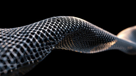 Close up view of flowing metallic mesh structure, showcasing intricate patterns and smooth, wavy form. design emphasizes modernity and innovation, with sleek appearance against dark background