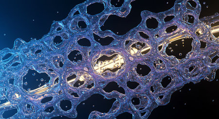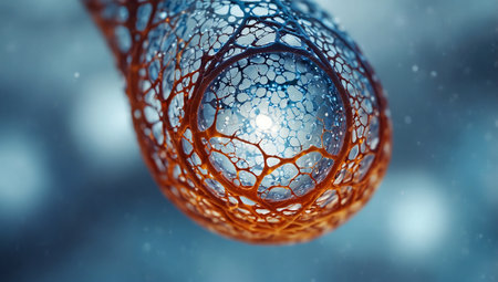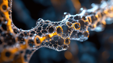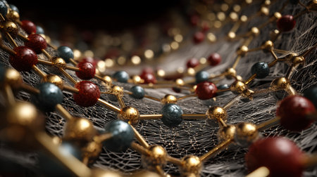 Close up view of intricate nanotechnology mesh with tiny spheres and metallic gold lattice structure, reflecting advanced materials and microscopic design..