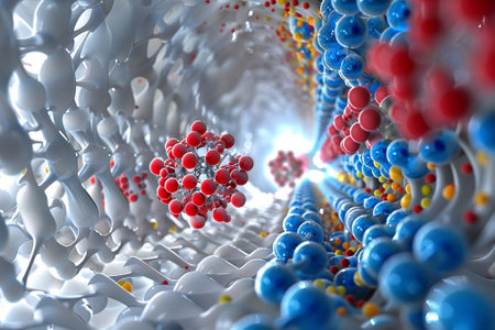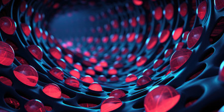 A close up of red and blue spheres in a black tunnel, AI