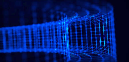 3d rendering of abstract digital wireframe tunnel with glowing particles.