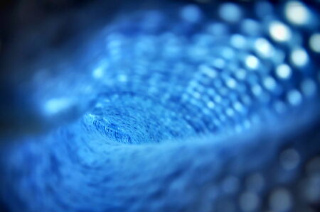 A striking close-up image of a blue wire mesh structure, depicting an intricate tunnel effect. The composition highlights the texture and depth against a dark background, showcasing modern design elements perfect for artistic or technological themes.