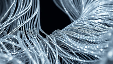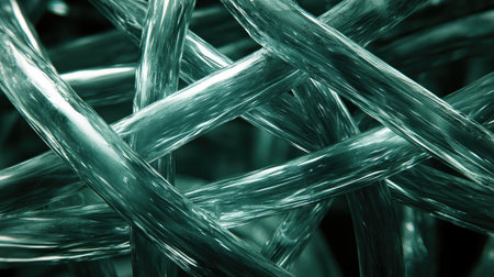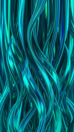 Close-up of intertwined, glossy teal and blue metallic strands create a fluid and vibrant abstract texture.