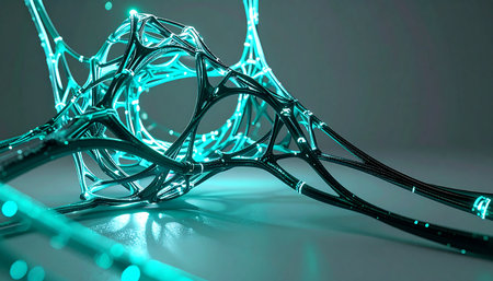 A glowing representation of an artificial intelligence neural network, where data flows like light through complex synapses.