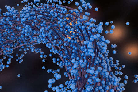 Flowing and glowing particles with dark background, 3d rendering. Computer digital drawing.