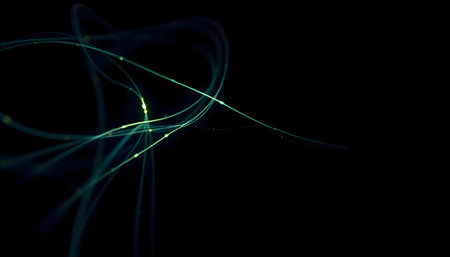 luminescent cables in digital scene, radiant neural filaments flow gently across shadowy digital landscape