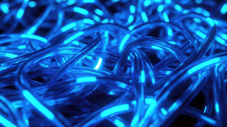 This vibrant abstract close-up features glowing blue neon tubes intertwined in a chaotic yet captivating design, perfect for tech and energy themes.