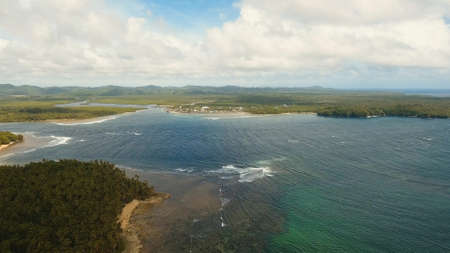 Aerial view: beach, tropical island, sea bay and lagoon, Siargao. Tropical landscape hill, clouds and mountains rocks with rainforest. Azure water of lagoon. Shore Landscape Bay. Seascape. Travel concept.