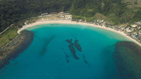 Aerial view of beautiful tropical beach with turquoise water in blue lagoon, Pagudpud, Philippines. Ocean coastline with sandy beach. Tropical landscape in Asia.