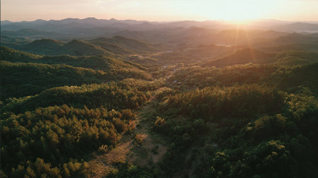 Sunrise Over a Mountainous Forest Landscape with Rolling Hills