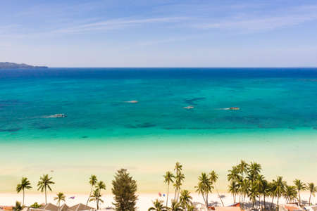Tropical beach with white sand and palm trees, view from above. Turquoise lagoon with a sandy bottom. Beach of the island of Boracay, Philippines.