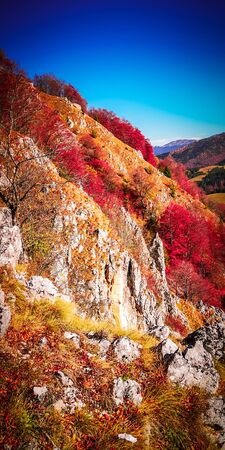Mountain autumn landscape with colorful forests. Alpine scene slopes covered with yellow and red trees.