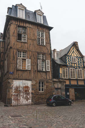 Old city center with historic half-timbered houses and modern cars in Rennes, Brittany, France