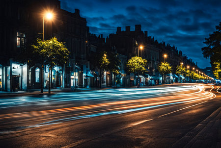 Central street in Blois with car lights trails, France. Beautiful evening city,