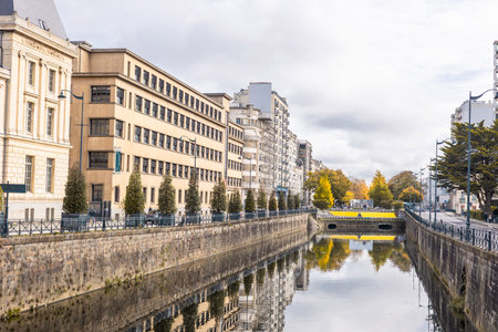 A calm canal runs through the center of Rennes, lined with elegant historic and modern buildings. Trees with autumn foliage reflect in the still water, creating a peaceful urban scene.