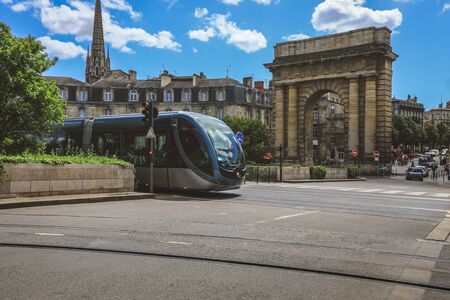 Tramway passing by fomous Porte de Bourgogne in Bordeaux, France