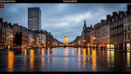 Rainy Evening City Street With Reflections and Illuminated Landmark