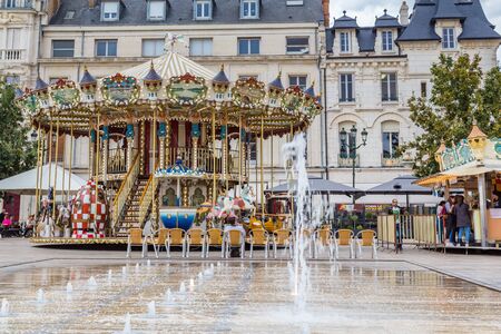 Orleans, France, October 14, 2019: Water fountain and traditional carousel at Place du Martroi in the center of Orleans in France, Europe