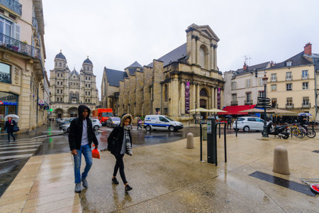 DIJON, FRANCE - OCTOBER 14, 2016: Street scene in the Place du Theatre, with typical old houses, locals and visitors, in Dijon, Burgundy, France