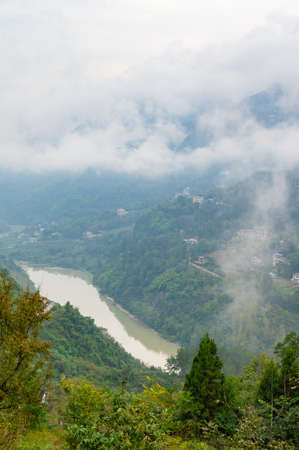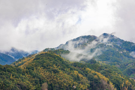 view of foggy mountain landscape at sunrise in China.