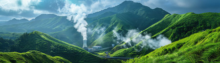 Geothermal power plant in lush green mountains, steaming towers