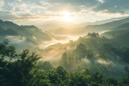 Stunning view of sun rays piercing through the mist in a lush, tropical valley, evoking serenity and beauty.