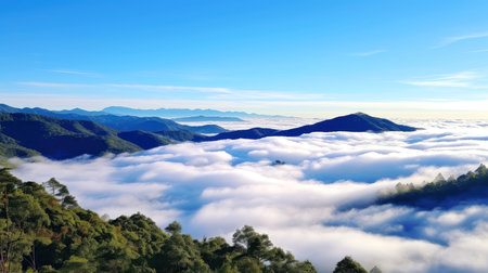 Misty mountain ranges create a serene landscape. A breathtaking view of nature's tranquility.