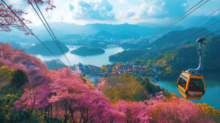 Aerial shot of cable cars amidst a landscape of fiery cherry blossoms, with Sun Moon Lakeaes serene waters and the distant cultural village in the background