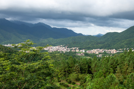 View of mountain with beautiful town, foggy over forest