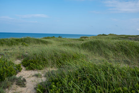 Scenic view of Cape Cod National Seashore on a sunny spring day. Seagrass and sand in the photo